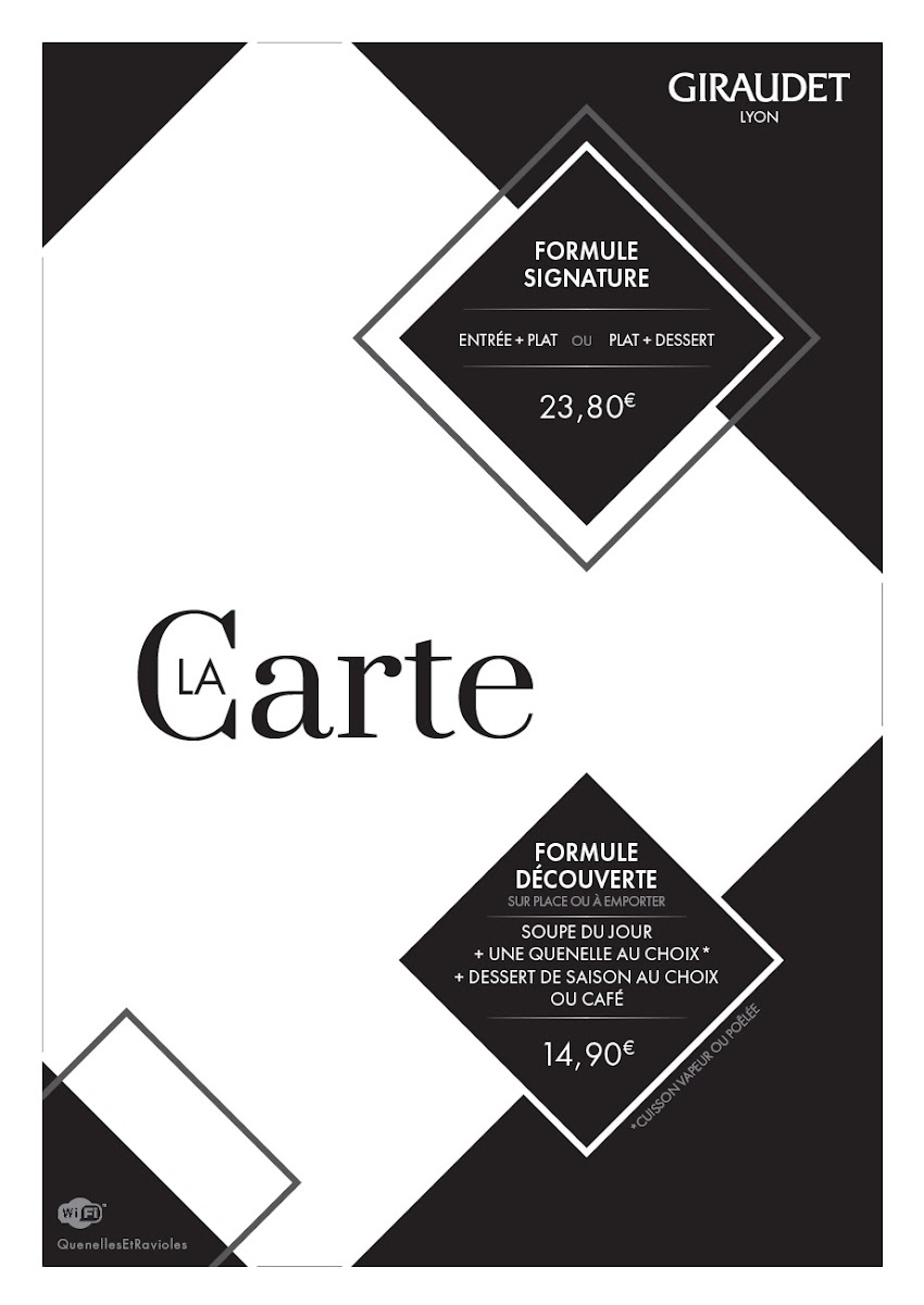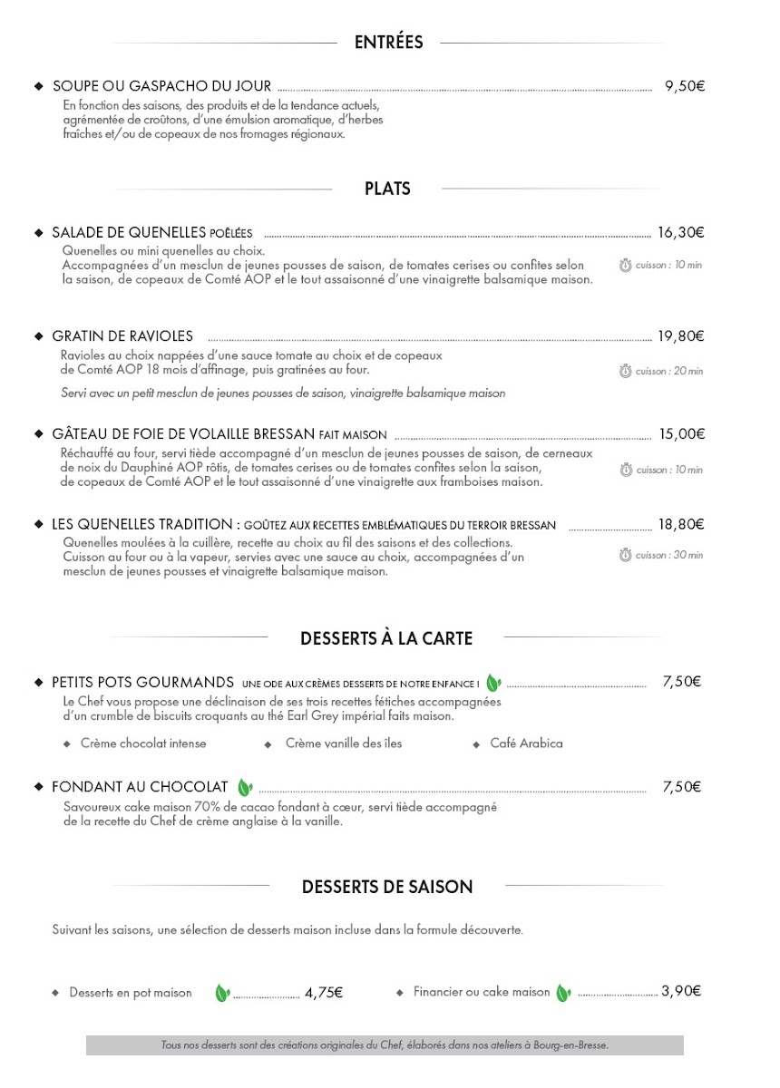 At Quenelles Giraudet, the menu is a celebration of Lyonnaise tradition elevated with finesse. Starters like Soupe Châtaigne Croutons Lamelles de Fromage offer a comforting, nutty richness, with delicate croutons and cheese shavings that melt into the chestnut base, setting a refined tone for the meal. For those seeking lighter fare, the Soupes A Déguster Sur Place Ou A Emporter provide both versatility and flavor, perfect for enjoying on-site or taking home without losing any of the depth or texture of the soups. The centerpiece of the menu is undoubtedly the Quenelle Poêlée Au Safran Et Sa Salade, where the quenelle is perfectly poached and then pan-seared, its saffron-infused sauce providing a subtle yet luxurious aroma, complemented by a crisp, fresh salad that balances the richness. The selection reflects a careful attention to traditional Lyonnaise recipes while allowing each ingredient to shine, making the menu both approachable and indulgent. From hearty soups to the refined elegance of the quenelles, the offerings at Quenelles Giraudet leave a lasting impression, demonstrating that even familiar classics can be transformed into memorable culinary experiences.